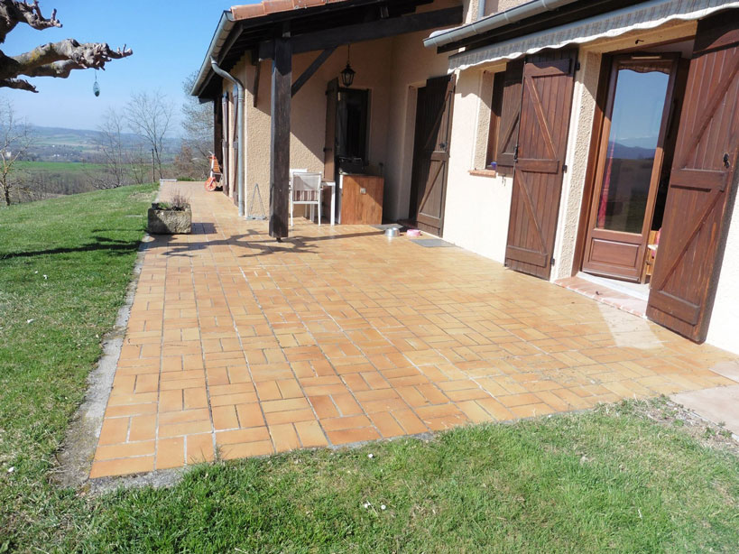 Après près de 20 ans d’usage et exposée aux aléas climatiques, une partie des carreaux de la terrasse se sont fissurés ou cassés. Il est souvent difficile de retrouver le carrelage posé des années auparavant, ainsi il a été décidé de refaire entièrement la terrasse en Résineo.