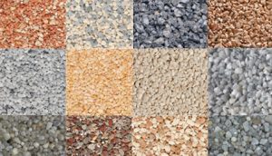 Le choix du granulat est primordial car il représente la partie majeure du revêtement (+90%) et donc son aspect esthétique. Les granulats minéraux couramment utilisés sont le marbre, le granit et le quartz. L’avantage du marbre est qu’il apporte une grande panoplie de couleurs à un coût raisonnable, par contre sa dureté est très variable en fonction de sa composition (structure calcaire métamorphique), il faut donc bien les sélectionner.