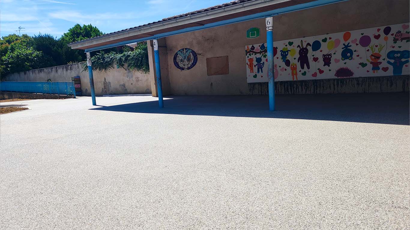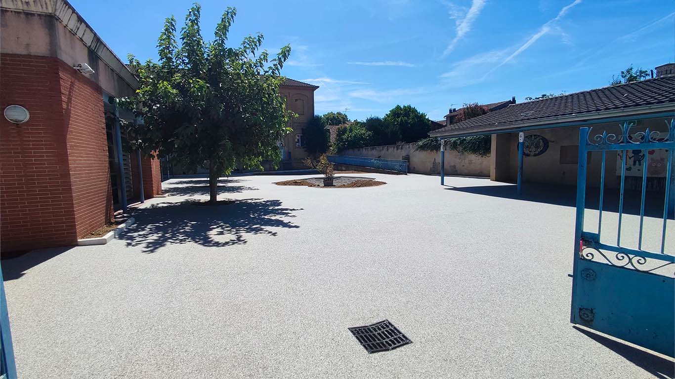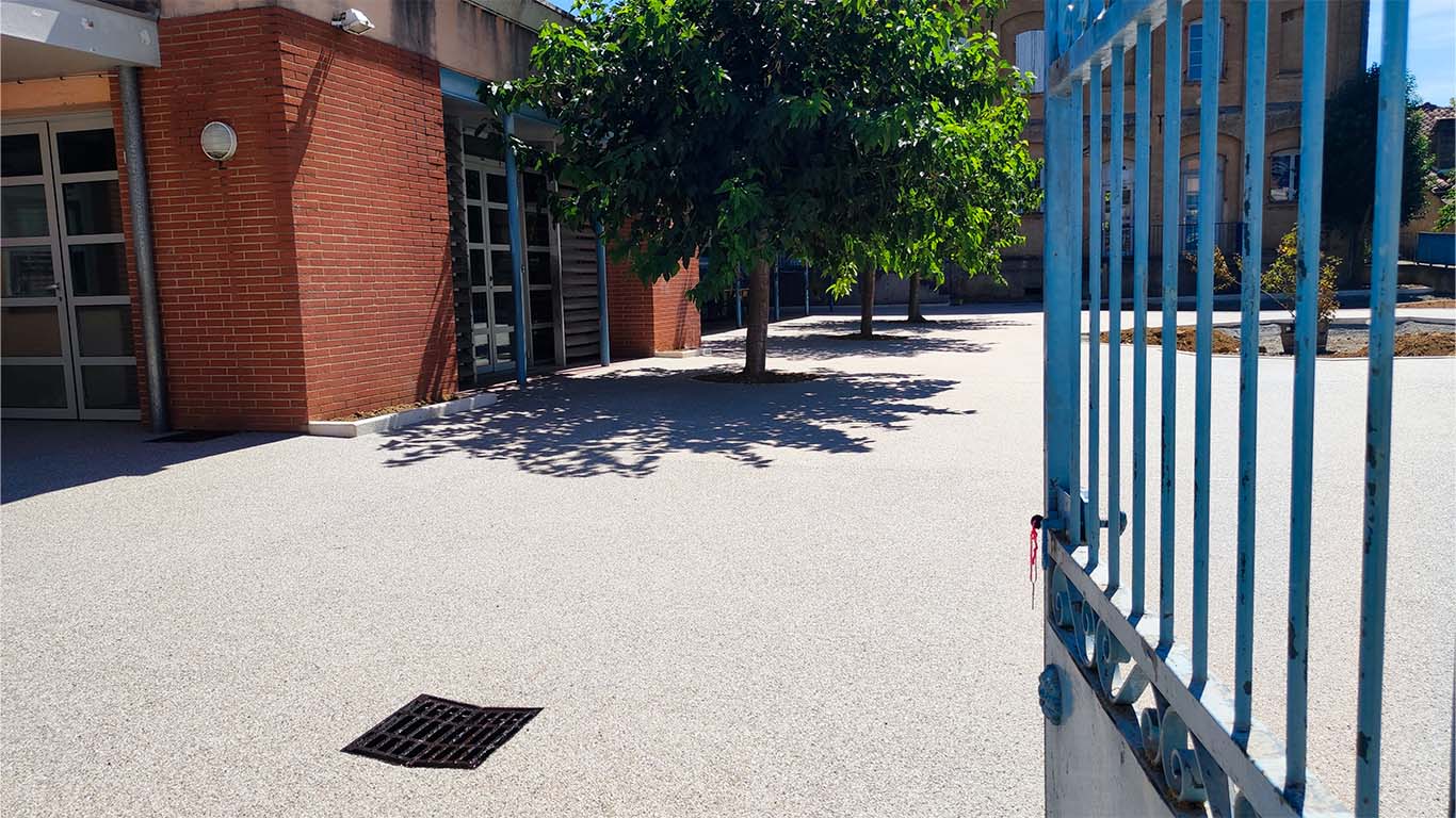 Chez Résineo, nous avons été consultés pour la réalisation d’une grande partie de la cour d’école en Résineo Quartz, un revêtement minéral constitué de granulats naturels de quartz liés entre eux par une résine transparente haute performance. Constitué à 97% de vide, notre revêtement est perméable jusqu’à 50L/m²/sec, il limite donc les eaux stagnantes, le risque de chute. Aussi, les cavités présentes dans le revêtement font qu’il est en moyenne 5°C plus frais qu’un matériaux pleins de même teinte. Enfin, nous venons appliquer un traitement de finition ayant pour but de renforcer le revêtement en surface mais surtout réduire la glissance du sol afin d’assurer la sécurité des enfants.