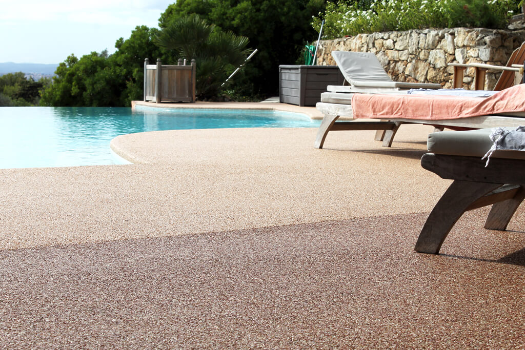 - Durabilité : notre revêtement, fabriqué à base de granulats minéraux naturels et d’un liant haute performance, résiste aux produits de traitement utilisés pour les piscines ainsi qu’aux UV garantissant une couleur stable dans le temps. De plus, il ne dégravillone pas, même en cas d’utilisation intensive.